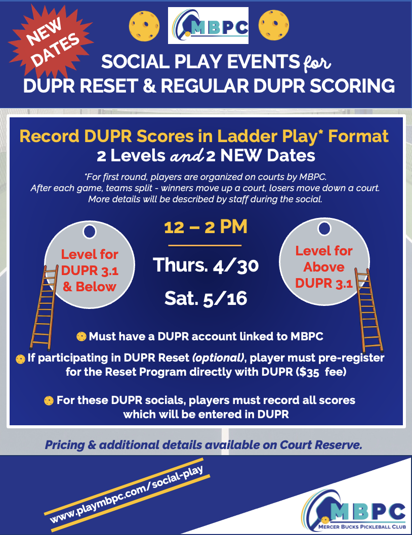 Register HERE for DUPR Scoring and DUPR Reset Ladder Socials